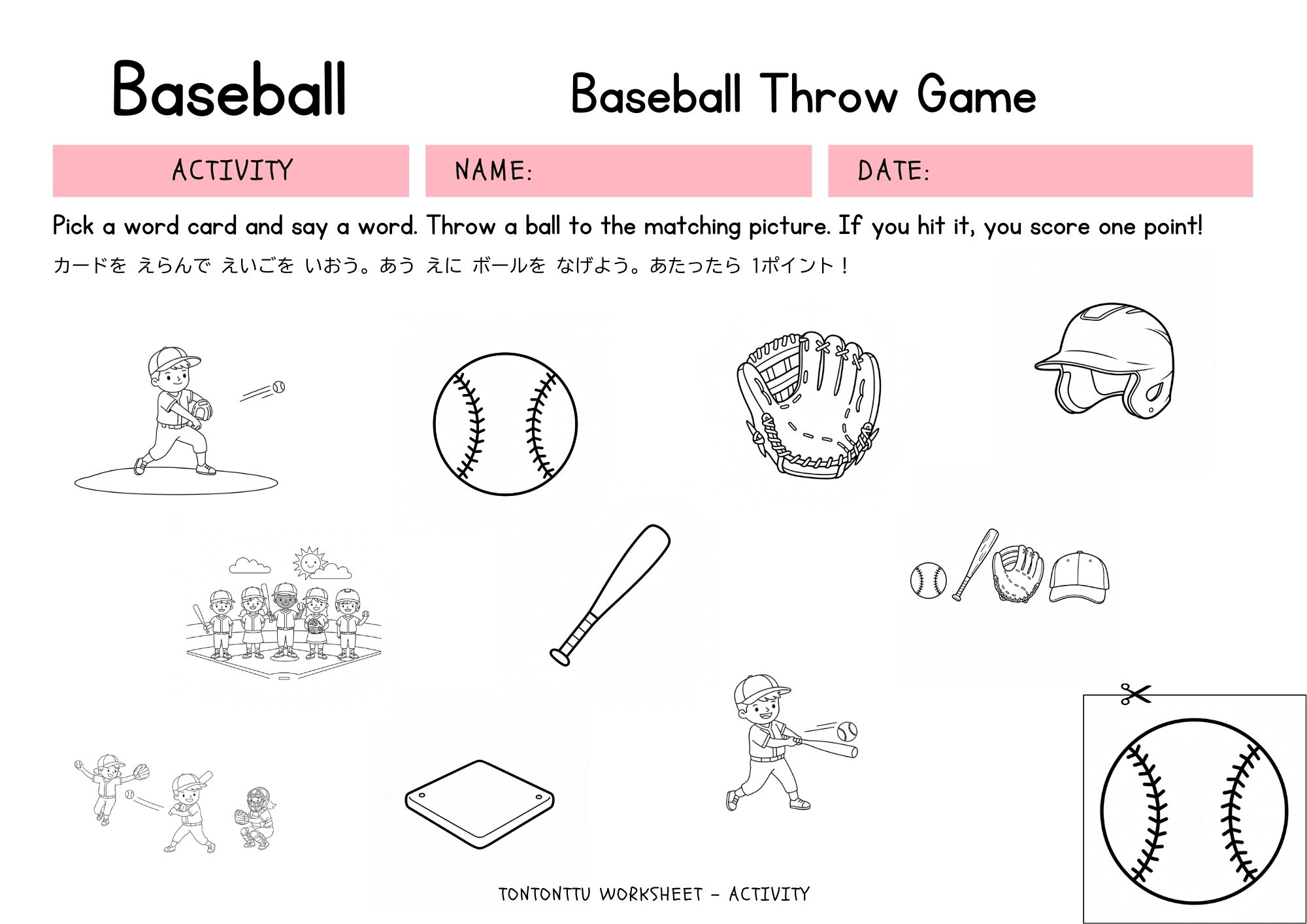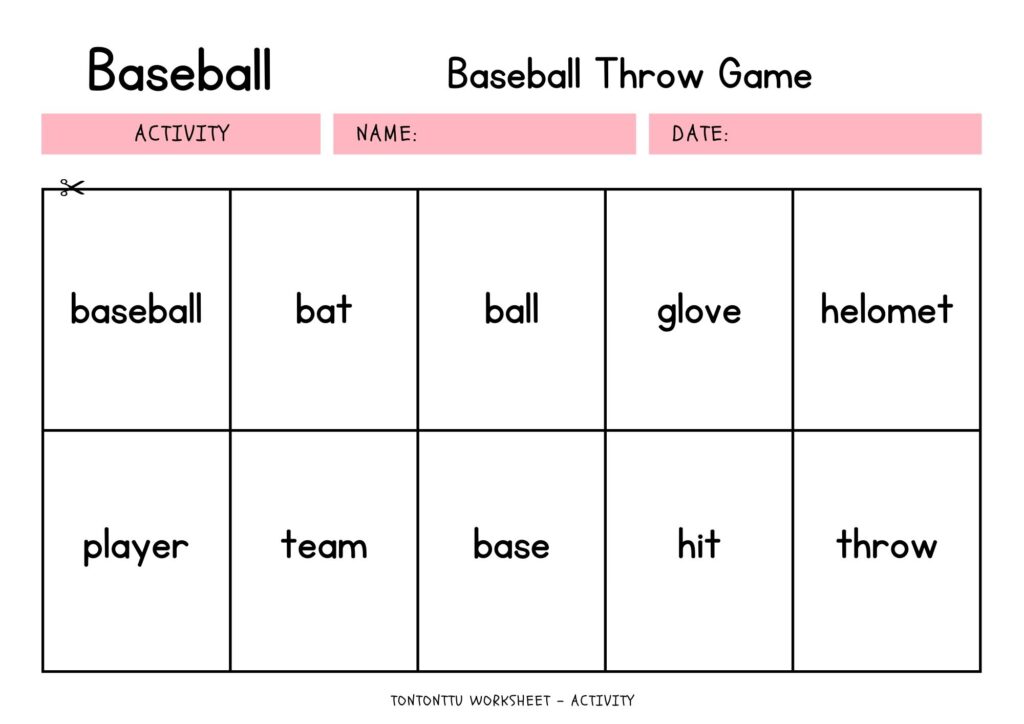 今回の英語のワークシートは、ボールを投げながら、野球に関する単語を覚えるアクティビティを作成しました♪