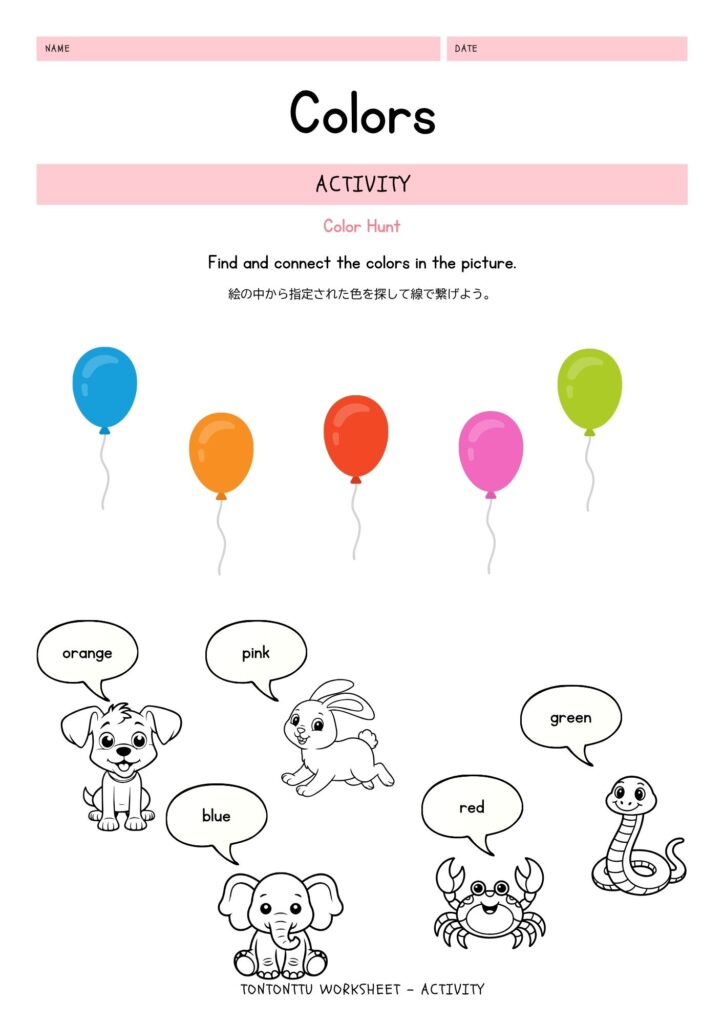 動物たちが言っている色の英語を読み、同じ色の風船へ線でつなぐマッチング遊び。