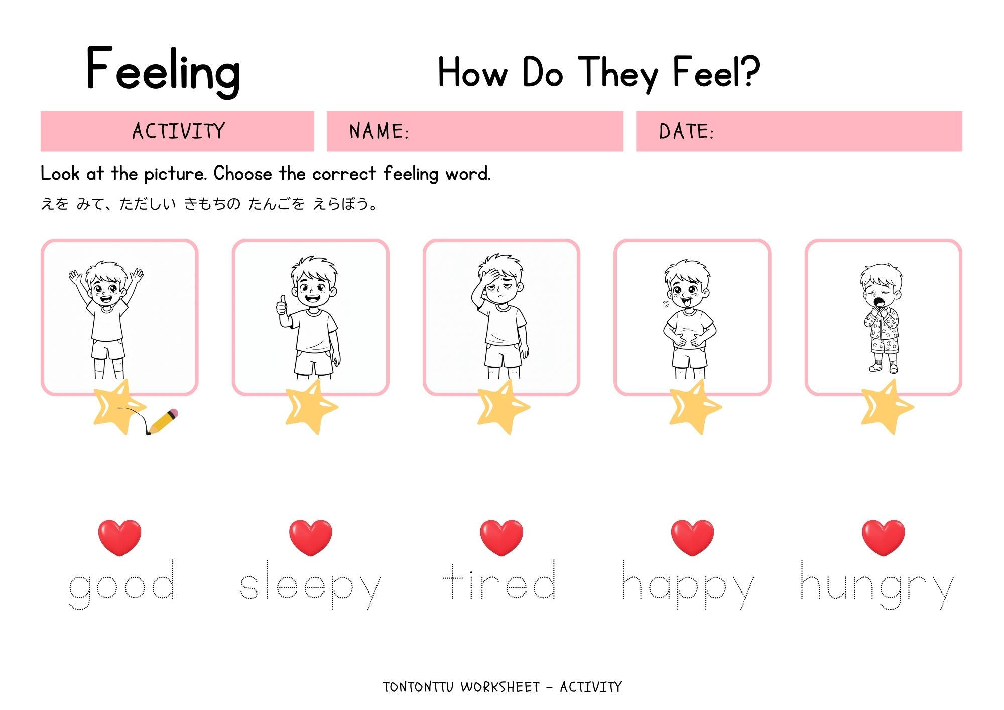 - 5つの気持ちの単語の意味を確認しながら、なぞり書きする
