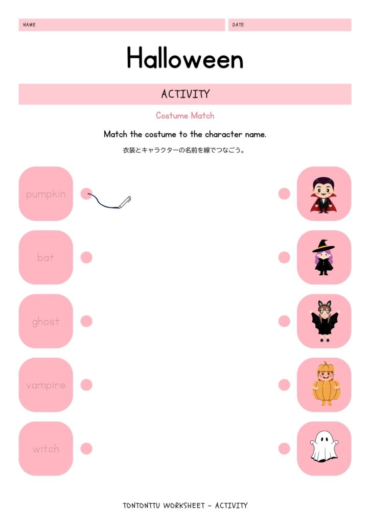 仮装のキャラクターと衣装の絵を線でつなぐことで、ハロウィンの単語を楽しく覚えられます。