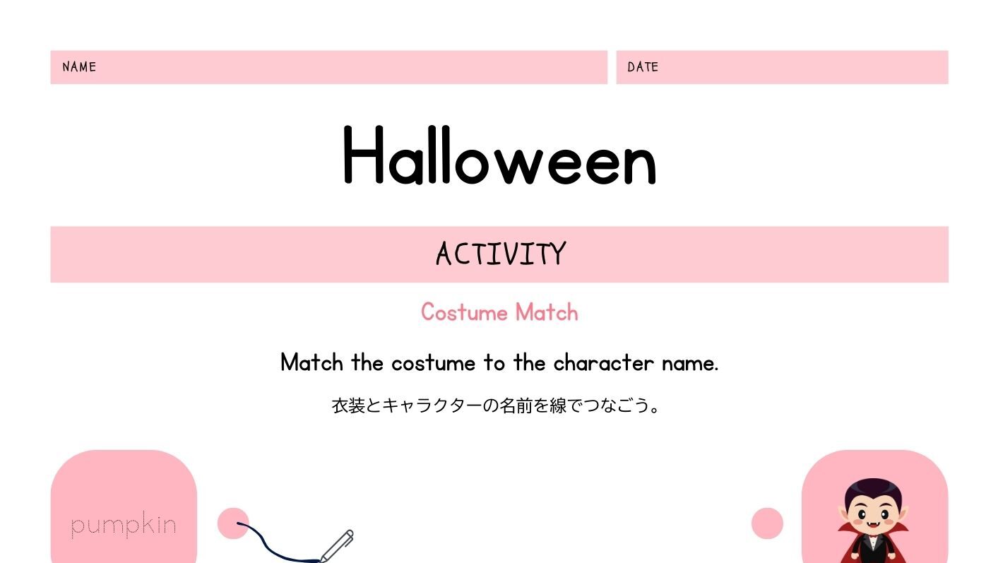キャラクターと衣装を結びつけることで、ハロウィン語彙を自然に身につけられます。