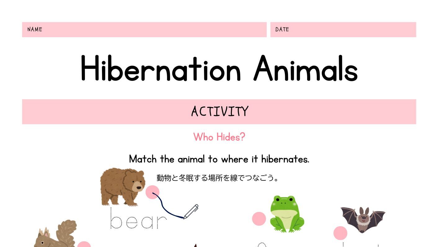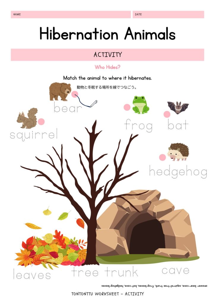 動物と冬眠する場所をつなぐことで、冬の自然の仕組みを子どもたちが直感的に理解できるアクティビティです。