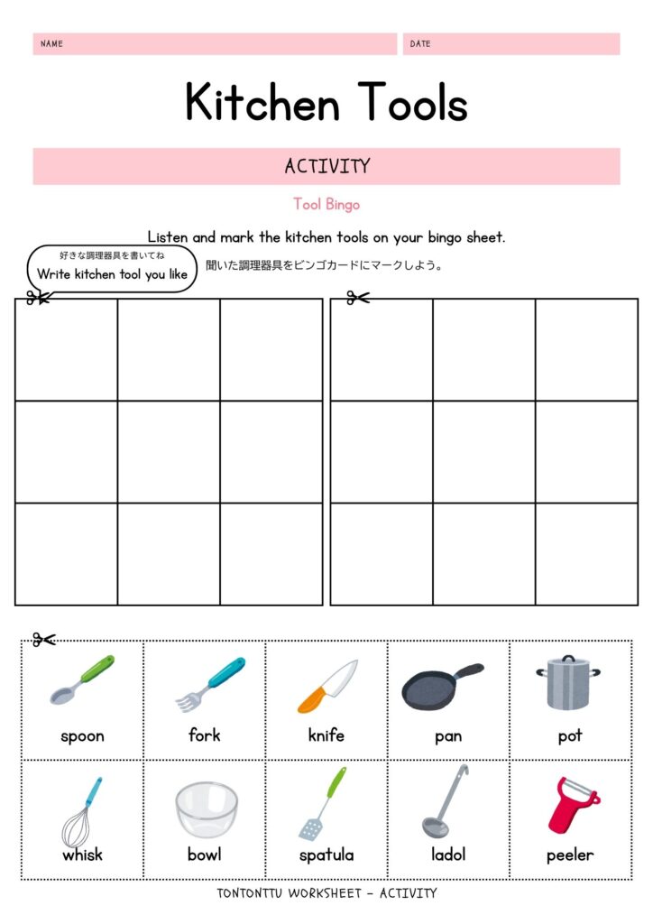 「Tool Bingo」は、先生や保護者が読み上げる調理器具の名前を聞いて、ビンゴカードにマークしていく英語アクティビティです。