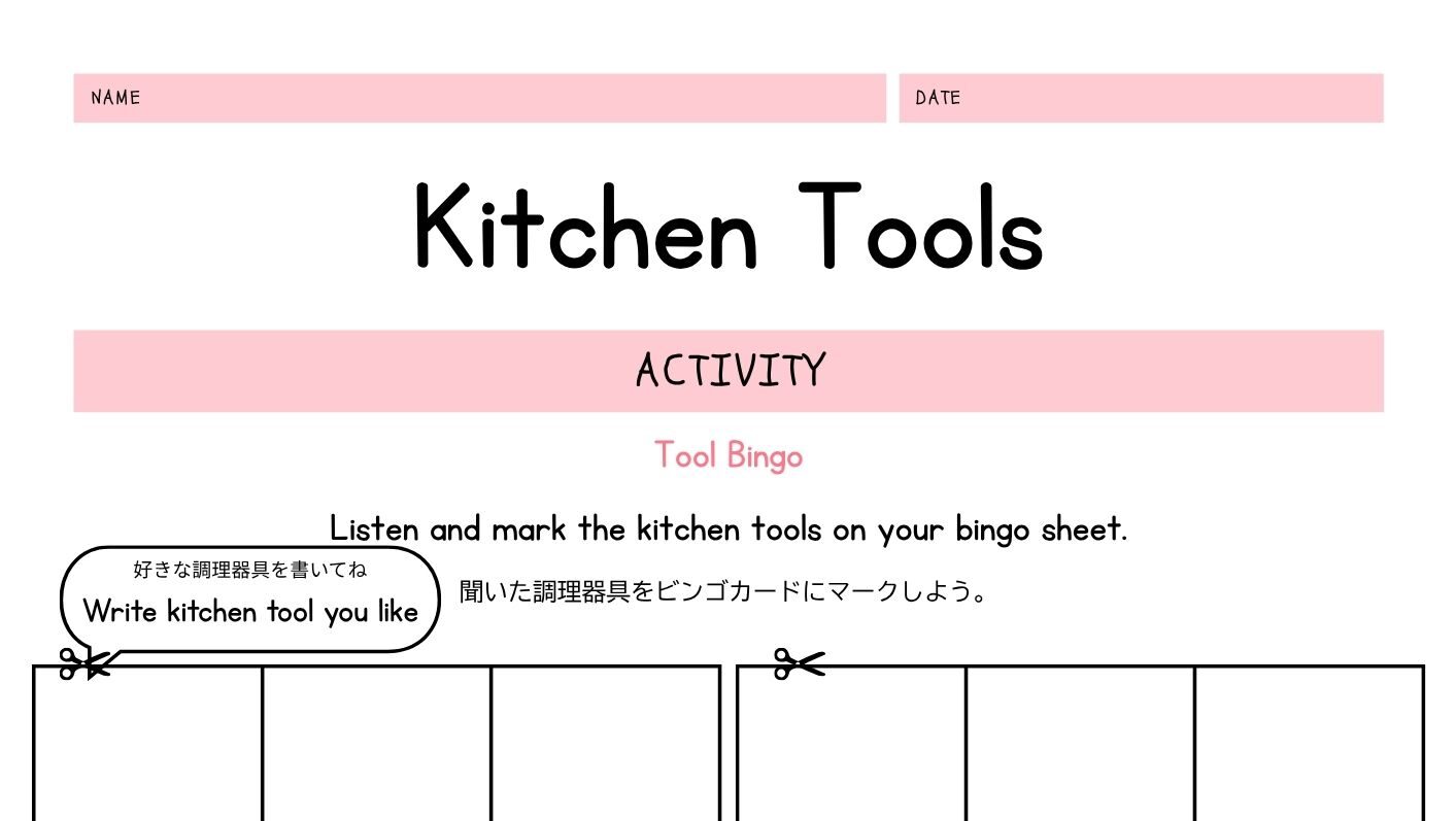 「Tool Bingo」は、先生や保護者が読み上げる調理器具の名前を聞いて、ビンゴカードにマークしていく英語アクティビティです。