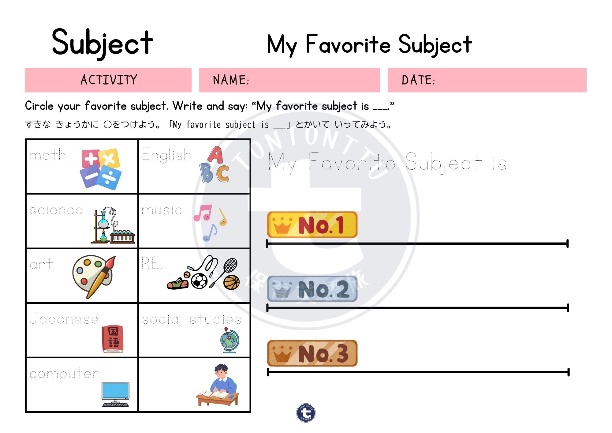 そんな話題が出たら、ぜひこのワークシートを使って「My favorite subject」の話をしてみましょう!