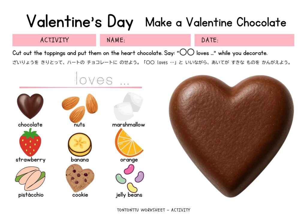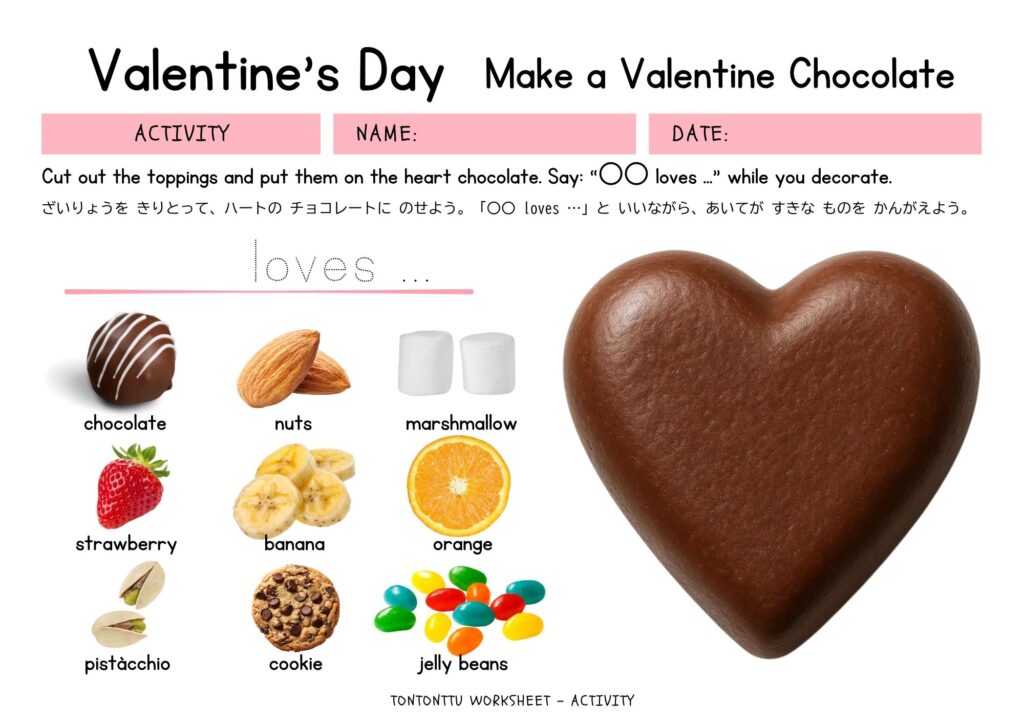 このアクティビティワークシートでは、トッピングを選んでチョコレートを作りながら、「〇〇 loves …」の英文を自然に口に出す練習ができます⭐️