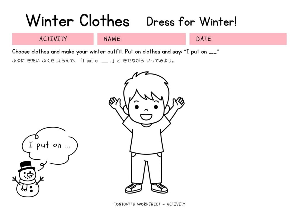 今回のワークシート Dress for Winter! では、服を組み合わせながら 「I put on ___」 を実際に声に出して練習できます。