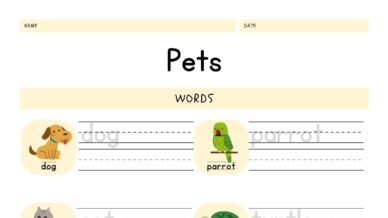 【動物:ペット】英語ワークシート|単語練習(dog・catなど10語)