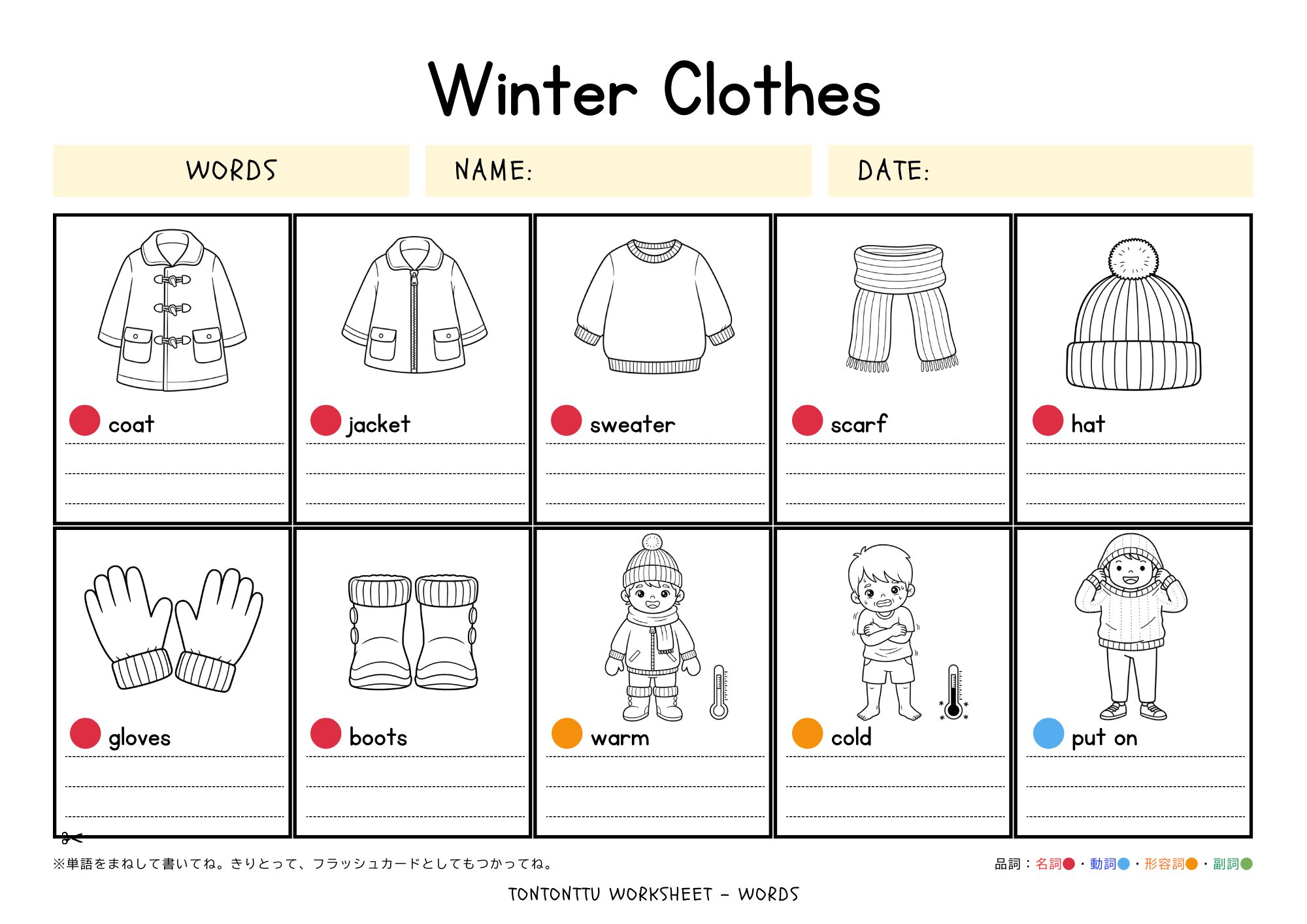 無料ダウンロード【冬の服英語】海外保育×子ども英会話のママ講師がつくるワークシート【冬の服|単語練習】