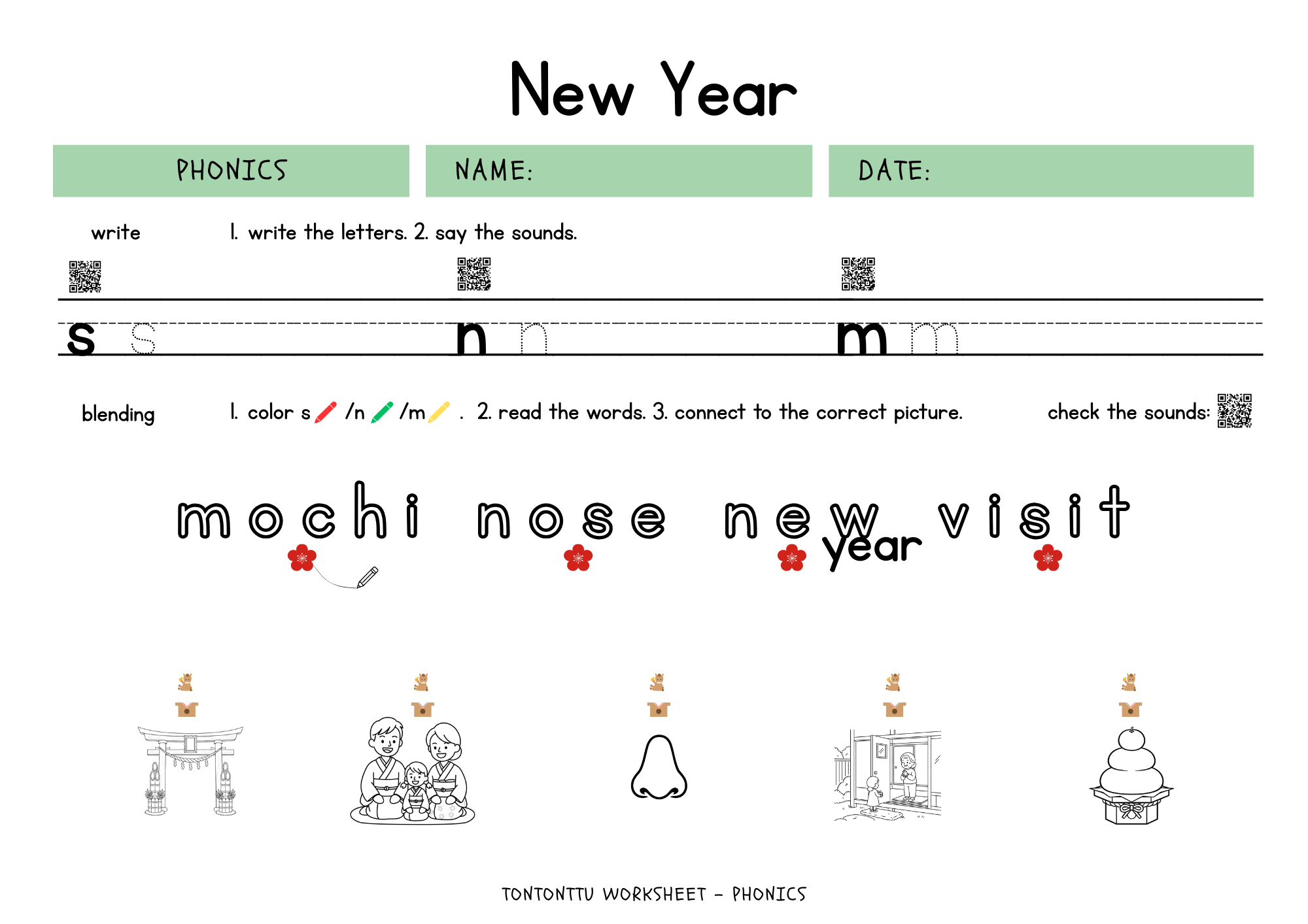 お正月の文化にふれながら、英語の音に親しめる「新年フォニックス」ワークシートです🎍
