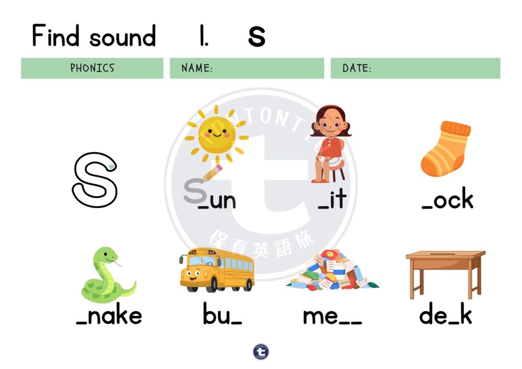 今回は、フォニックスの最初の音「s」を学べるワークシートを作成しました🔤