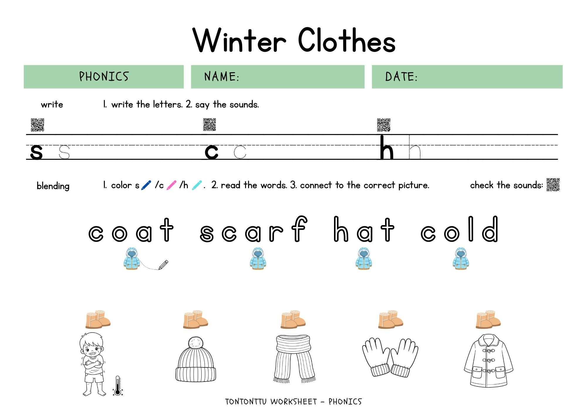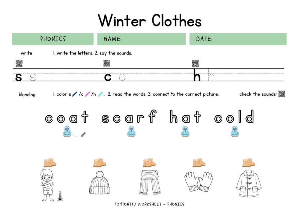 このプリントは、アルファベット「s」「c」「h」の音を丁寧に練習し、冬の服の単語を音から読む力を育てます♪