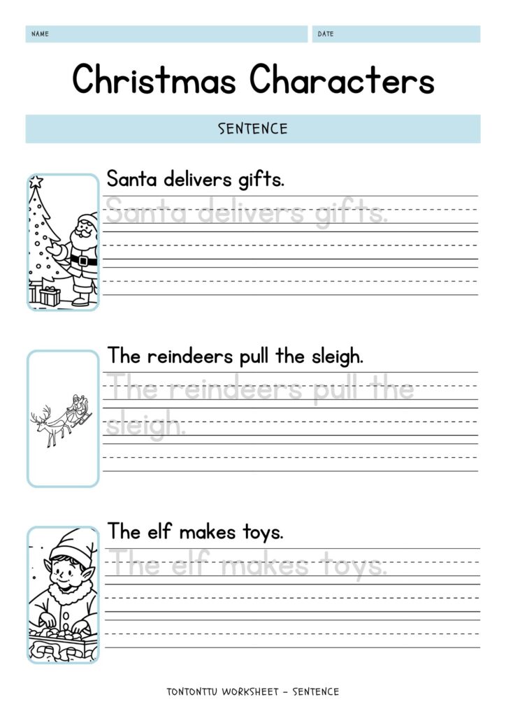今回は、サンタやスノーマンなどのキャラクターを使った簡単な英文3つを練習できるワークシートをご紹介します。