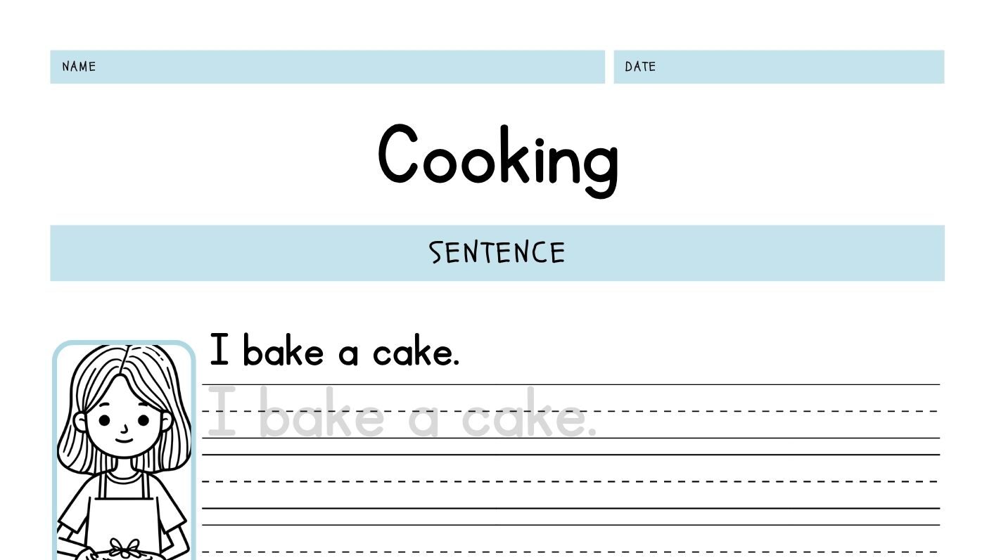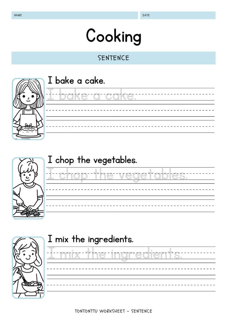【料理】海外保育×子ども英会話のママ講師がつくる文章練習ワークシート 【ワークシート】文章練習 2025.10.282025.10.30 スポンサーリンク 料理に使う実際の動作と結びつけて学べる英語フレーズを集めました。 動作をまねしながら声に出すことで、自然に英文のリズムを身につけられます。 スポンサーリンク 目次 学べる文章ワークシートダウンロードまとめ 学べる文章 I bake a cake. I chop the vegetables. I mix the ingredients. ワークシートダウンロード cookingダウンロード まとめ 単語の意味を理解するだけでなく、「I〜」で始まる簡単な英文を通して英語の文法の土台を作ることができます♪ 実際のクッキング体験と一緒に、楽しく英語で表現してみましょう! 他の料理のワークシートをチェックする➡️ 【料理×英語】海外保育×子ども英会話のママが選ぶ!子どもが夢中になる歌・絵本3選子どもたちは「お料理ごっこ」が大好き!今回は「料理(Cooking)」をテーマに、英語の歌と絵本を3つずつ紹介します。海外の保育現場でも人気の楽曲や絵本を中心に選びました。記事の最後には、料理に関する...