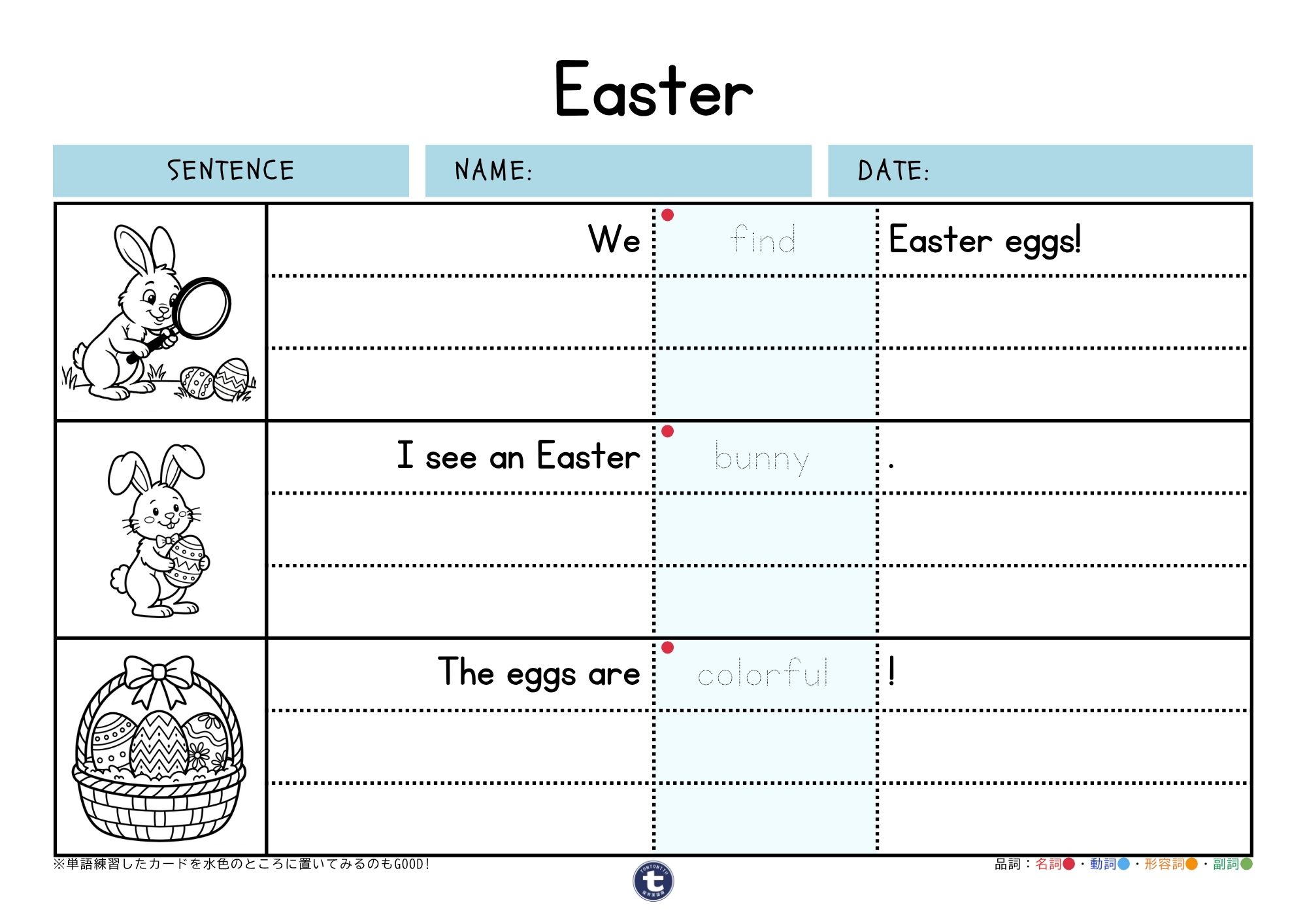 【イースター×英語】子ども向け英文章練習プリント|元保育士が作成 会員限定 【ワークシート】文章練習 2026.03.24 スポンサーリンク Happy Easter! 海外のイベントだからこそ、英語を学ぶチャンス♪ 単語練習で学んだ単語を文章でも覚えてみましょう⭐️ スポンサーリンク 目次 学べる文章ワークシートダウンロードまとめ 学べる文章 We find Easter eggs! I see an Easter bunny. The eggs are colorful! 単語練習のカードを置き換えて文章を作ってみてもGood! ワークシートダウンロード 📌 このワークシートダウンロードには会員登録が必要です 👉 会員になる(月額500円)初月無料! 🔹 無料ワークシートを見る (Easter) sentence worksheetダウンロード まとめ イースターといえば、エッグハントゲーム! 遊びながら英語も使って、楽しく海外のイベントに親しんでみましょう♪ 他のイースターのワークシートをチェックする イースターのアクティビティ楽しもう♪おすすめの音楽、絵本紹介!Here comes Easter!イースターがやってきました♪春の訪れとともにやってくるイースター(Easter)!カラフルな卵、うさぎ、ひよこなど、子どもたちが楽しめるイベントがいっぱいです。今回は、イースターに関する英単語やフレーズ、...