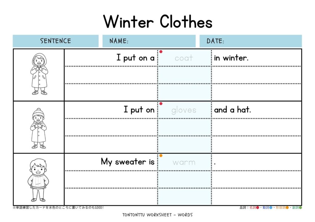 冬に着る服をテーマに、英語の文章練習ができる子ども向けワークシートをご紹介します!