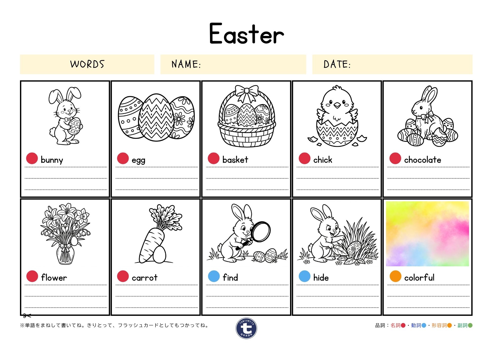 今回は、イースターテーマの、フラッシュカードにもできる英単語練習プリントを作りました🐇