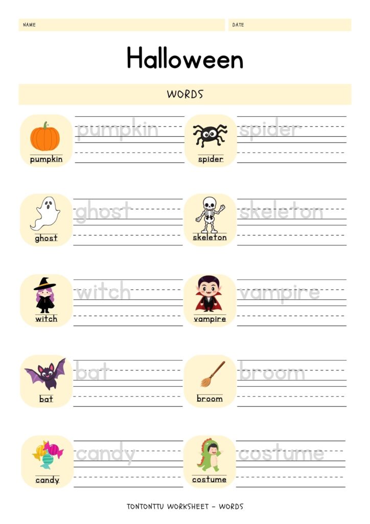 ハロウィンでよく出てくる英単語10語を楽しく覚えられる構成です。