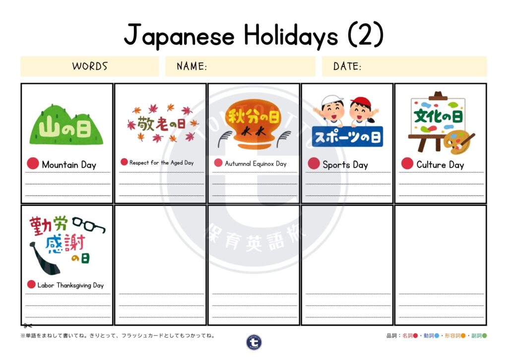 今回は、そんな日本の祝日を全て英語で覚えられるワークシートを作成しました!