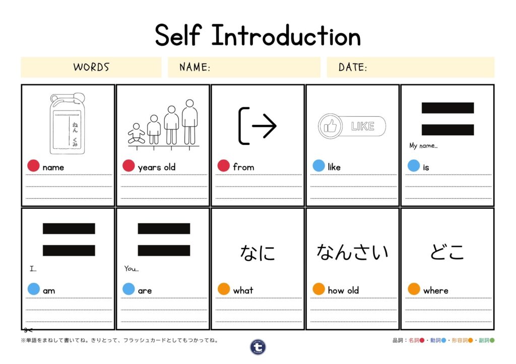 今回は自己紹介を学習する子たちをサポートするための、フラッシュカードにもなる単語ワークシートを作成しました!